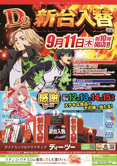 | 特 徴 | ④パチ-276台・①パチ-160台 ㉑スロ-252台・⑤スロ-89台 店内環境:Free Wi-Fi / 携帯充電器 喫煙環境:屋内喫煙室/屋外喫煙スペース 安全対策:感染症予防のための飛沫防止ボード設置 |